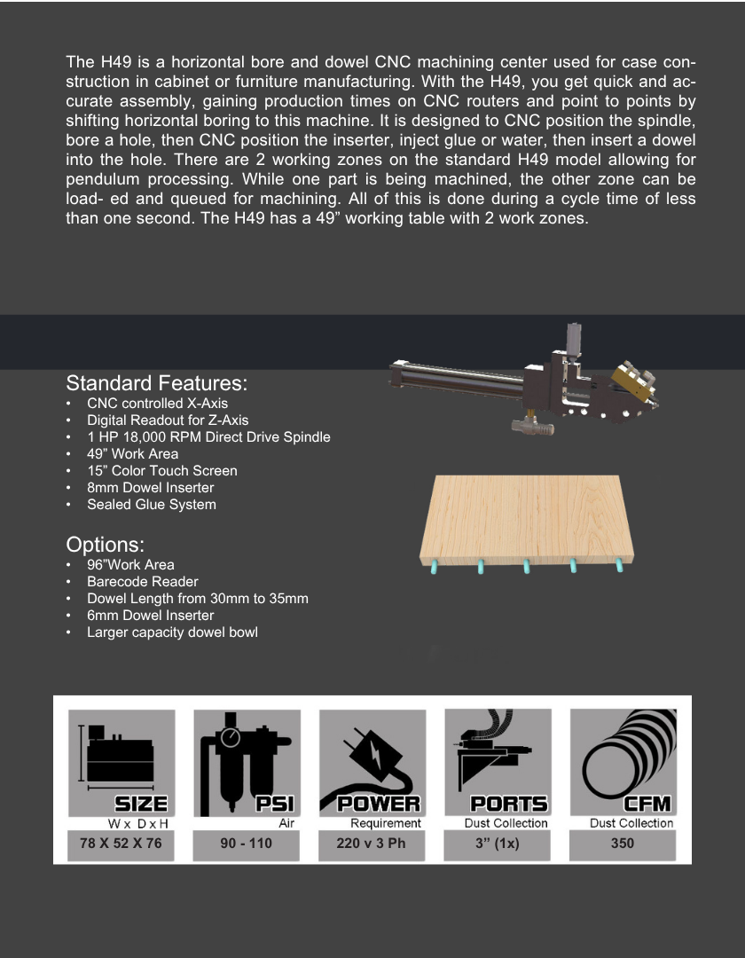 With the H49, you get quick and accurate assembly, gaining production times on CNC routers and point to point by shifting horizontal boring to this machine.