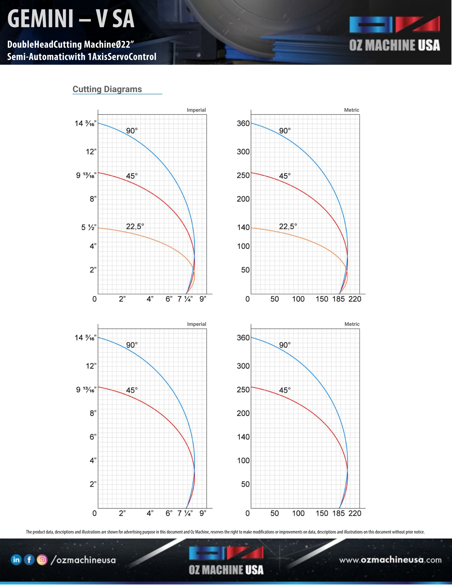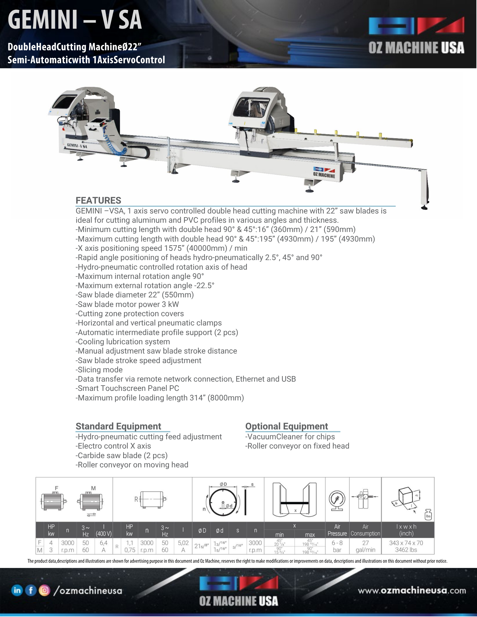 GEMINI – V SA, double head front blade saw Ø 22" with automatic positioning and semi-automatic angle adjustment, is an ideal option for cutting aluminium and PVC profiles in different angles and thicknesses. GEMINI – V SA performs quick hydro-pneumatic angle positioning in 2 inclination models of -22.5°, -45°, 90° and 90°, 45° angles, while the heads that perform manual positioning in all other intermediate angles provide a perfect cutting process. While providing the cutting processes of profiles with a minimum length of 480 mm and a maximum of 16ft simultaneously with two heads, it also eliminates the limits in cutting of profiles. While increasing the cutting quality with its automatic horizontal and vertical clamps and profile support unit, GEMINI – V SA also prioritizes safety.