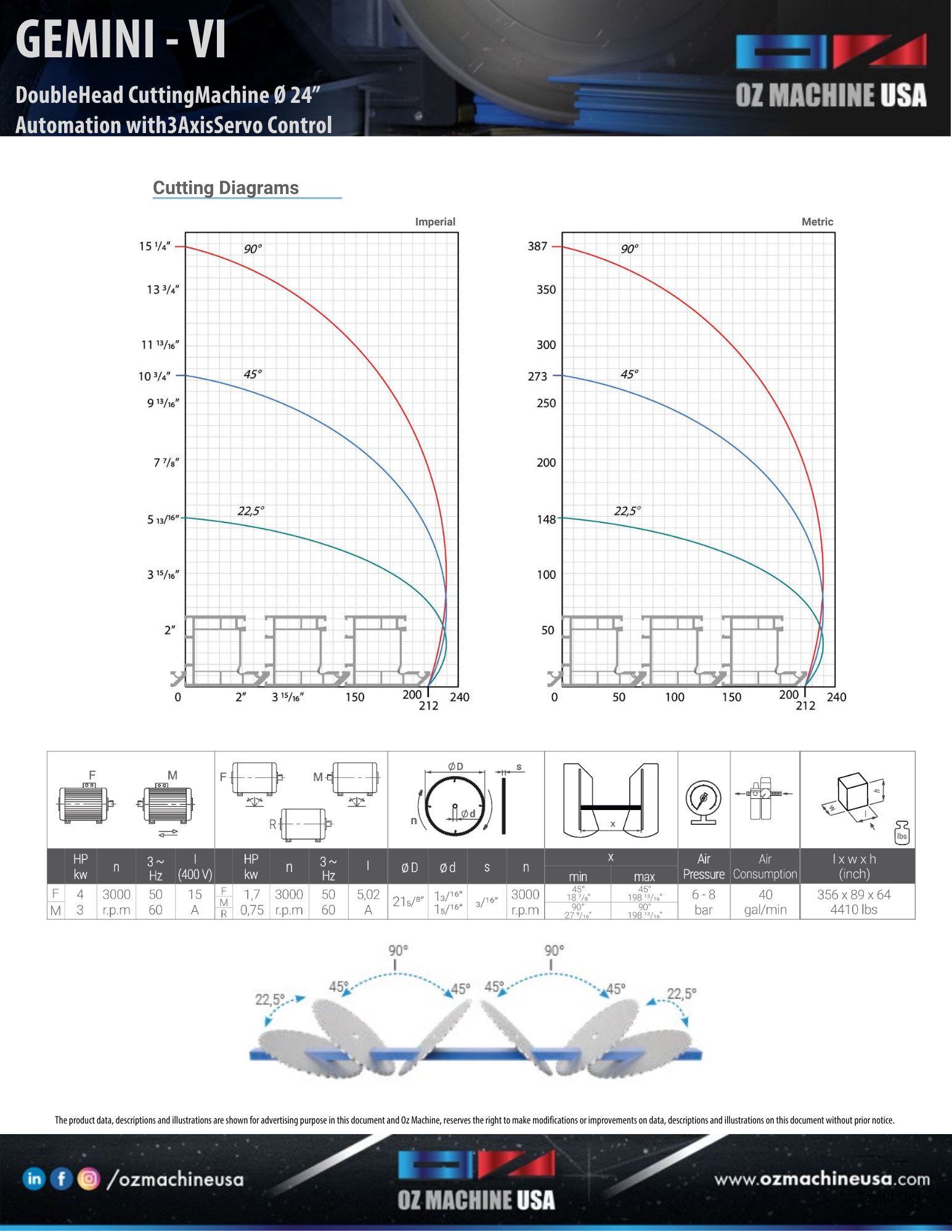 3 axis servo controlled double head front blade saw with 600 mm saw blades GEMINI – VI is ideal for cutting aluminum and PVC profiles in various angles and thickness. GEMINI – VI has been designed to cut wider profiles and provides rapid and automatic positioning of heads with servo control at any angles between -22.5° and 45° Double head GEMINI – VI enables simultaneous cutting of profile lengths from 480 mm to 5050 mm and eliminates barriers for cutting of 5050 mm and longer profiles. Safety is a topmost priority for GEMINI – VI together with the horizontal and vertical clamps along with profile support units which improve the cutting quality.