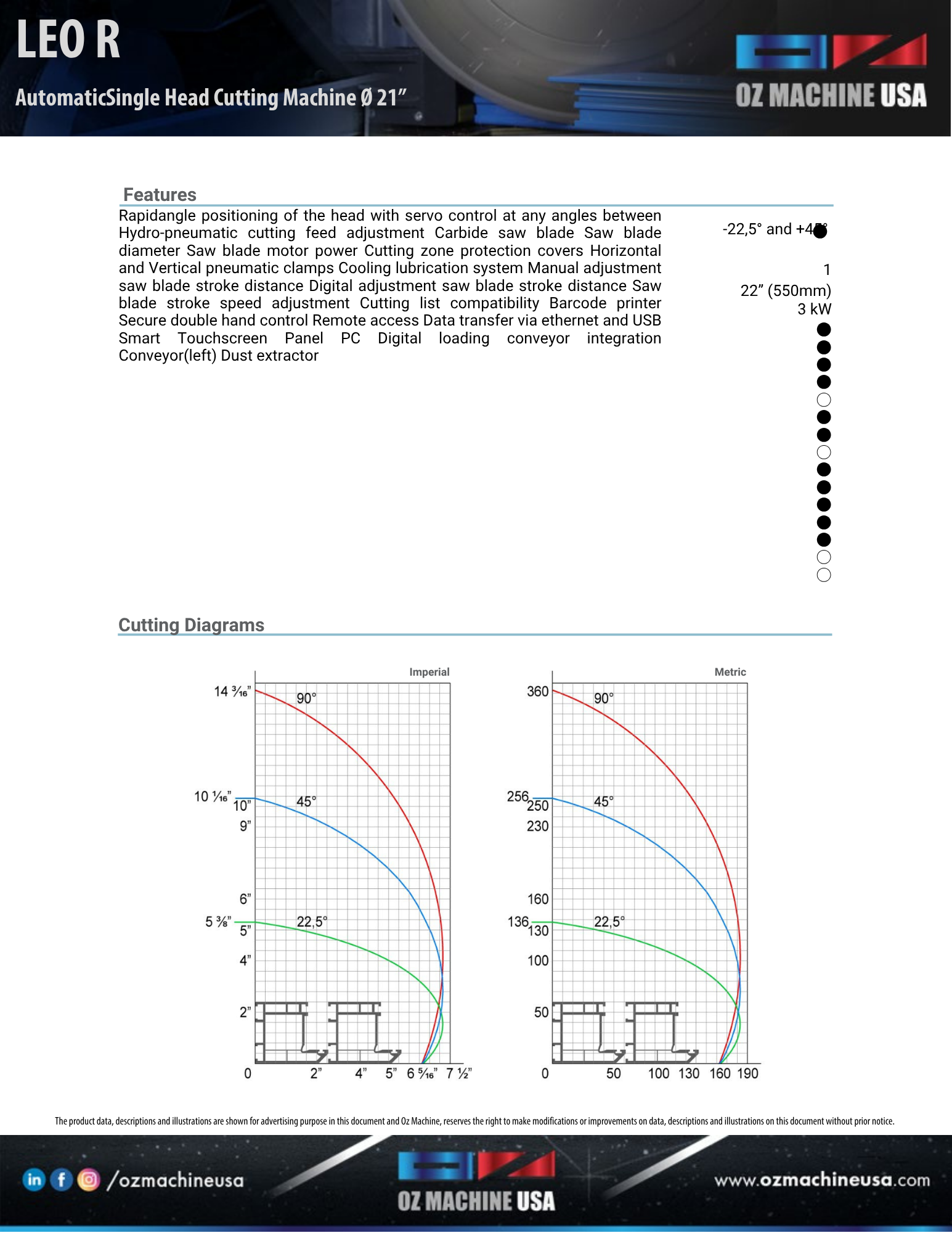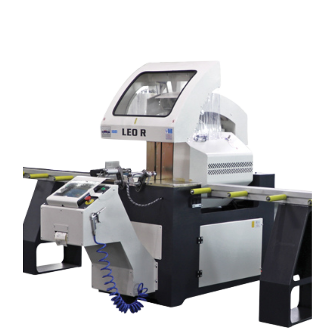LEO-R Automatic front blade saw with 2 axis servo controlled and 550 mm saw is ideal for cutting aluminum and PVC profiles with different angles and thickness LEO-R designed for cutting wider profiles with the servo motion system, automatic positioning at all degrees between -22,5° and 45° allows for perfect cutting operation. Safety is a topmost priority for LEO-R together with the horizontal clamps and the vertical clamp along with profile protective shield which improve the cutting quality.