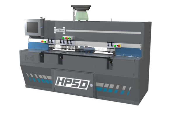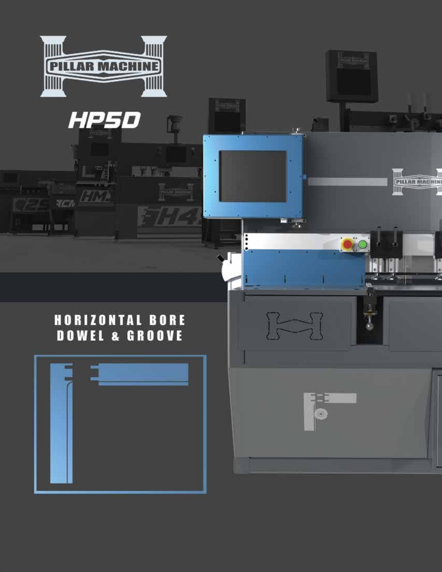 The model HP5D is a horizontal point to point bore and dowel insertion and panel groove machining center. It is designed to CNC position a drill spindle, bore a hole, then CNC position the dowel inserter, inject glue or water (for pre-glued dowels), and insert the dowel into the hole. As well as cut a panel groove in the center section of the inside edge of the door stile and the entire inside edge of the door rail material.