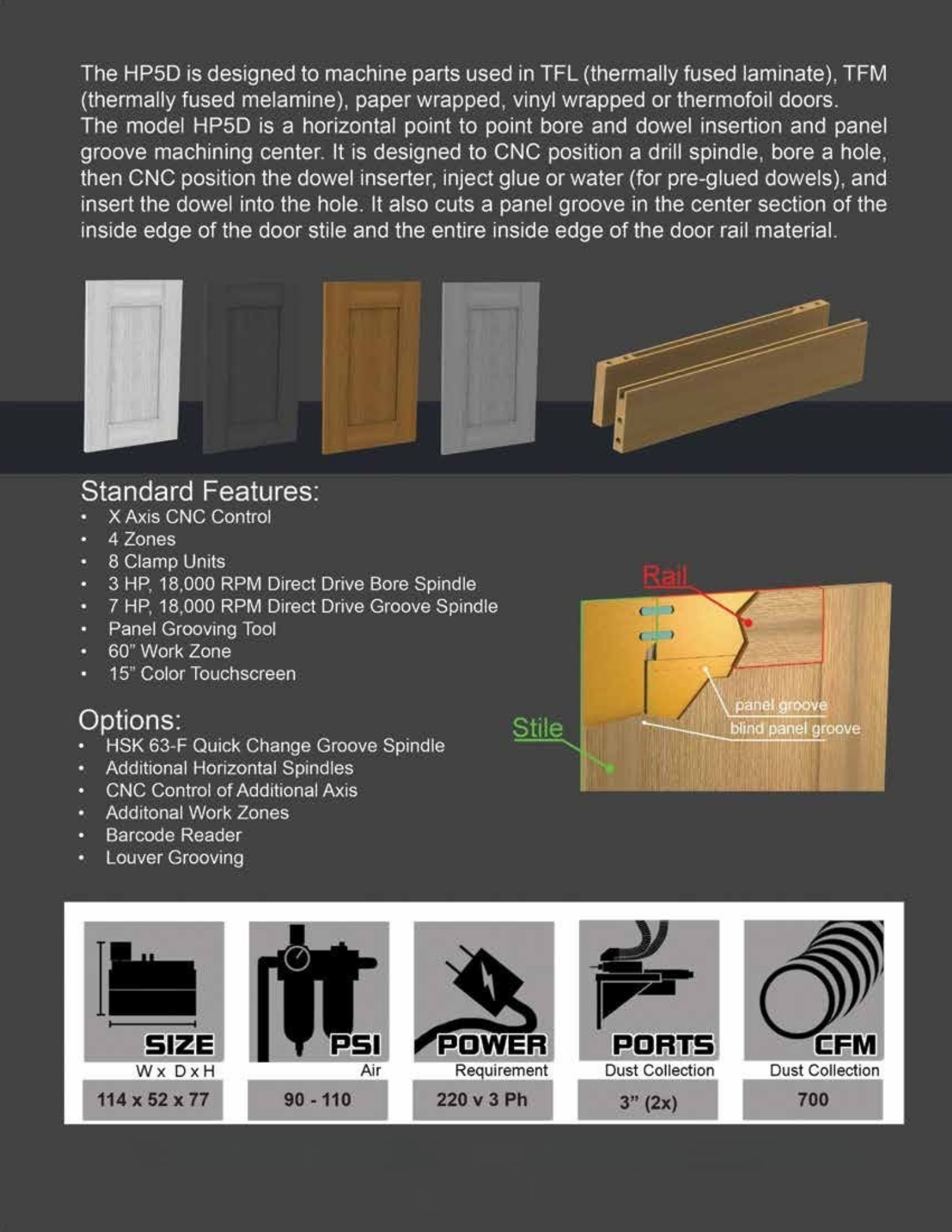 The HP5D is designed to machine parts used in TFL (thermally fused laminate), TFM (thermally fused melamine), paper wrapped, vinyl wrapped or thermofoil doors.